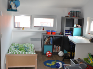 Tento dům není zvětšovaný, s přidaným fixním oknem v obývacím pokoji, horní pokoj je rozdělený na dva dětské pokoje s přidanými okny ve štítě. Koupelna v patře má zkosenou příčku (varianta koupelny číslo 3), v ložnici je vestavná skříň nad schodištěm a prakticky řešená otevřená šatna.