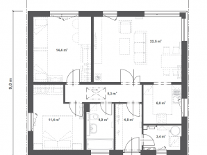 Půdorys nízkopodlažního domu Bungalov 72 S Vás potěší svou jednoduchostí. Rozměry 9,9 × 9 m a sedlová střecha činí z tohoto domu ideálního kandidáta do jakékoliv zástavby. Srdcem domu je obývací pokoj spojený s jídelnou s přímým vstupem do kuchyně. Tento prostor je díky několika velkým oknům prosvětlený a vzdušný. Zároveň poskytuje přímé spojení s venkovní terasou a zahradou. Mysleli jsme i na praktickou technickou místnost.